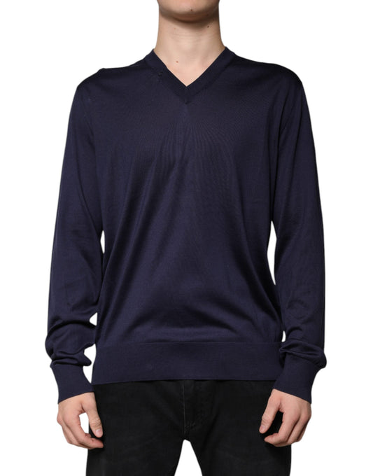 Dolce & Gabbana Navy Blue Silk V-neck Pullover Sweater