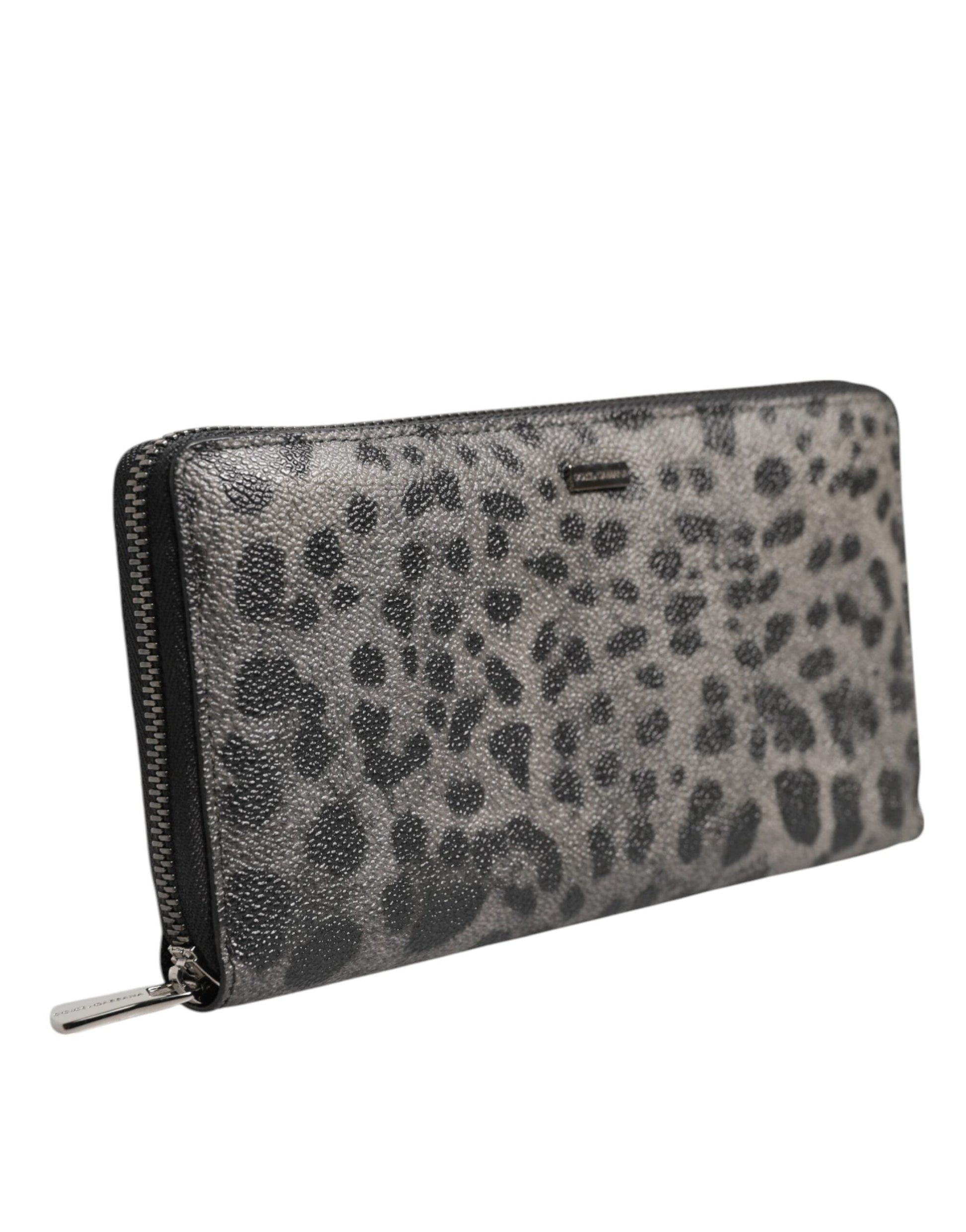 Dolce & Gabbana Black Gray Leopard Leather Zip Around Continental Wallet