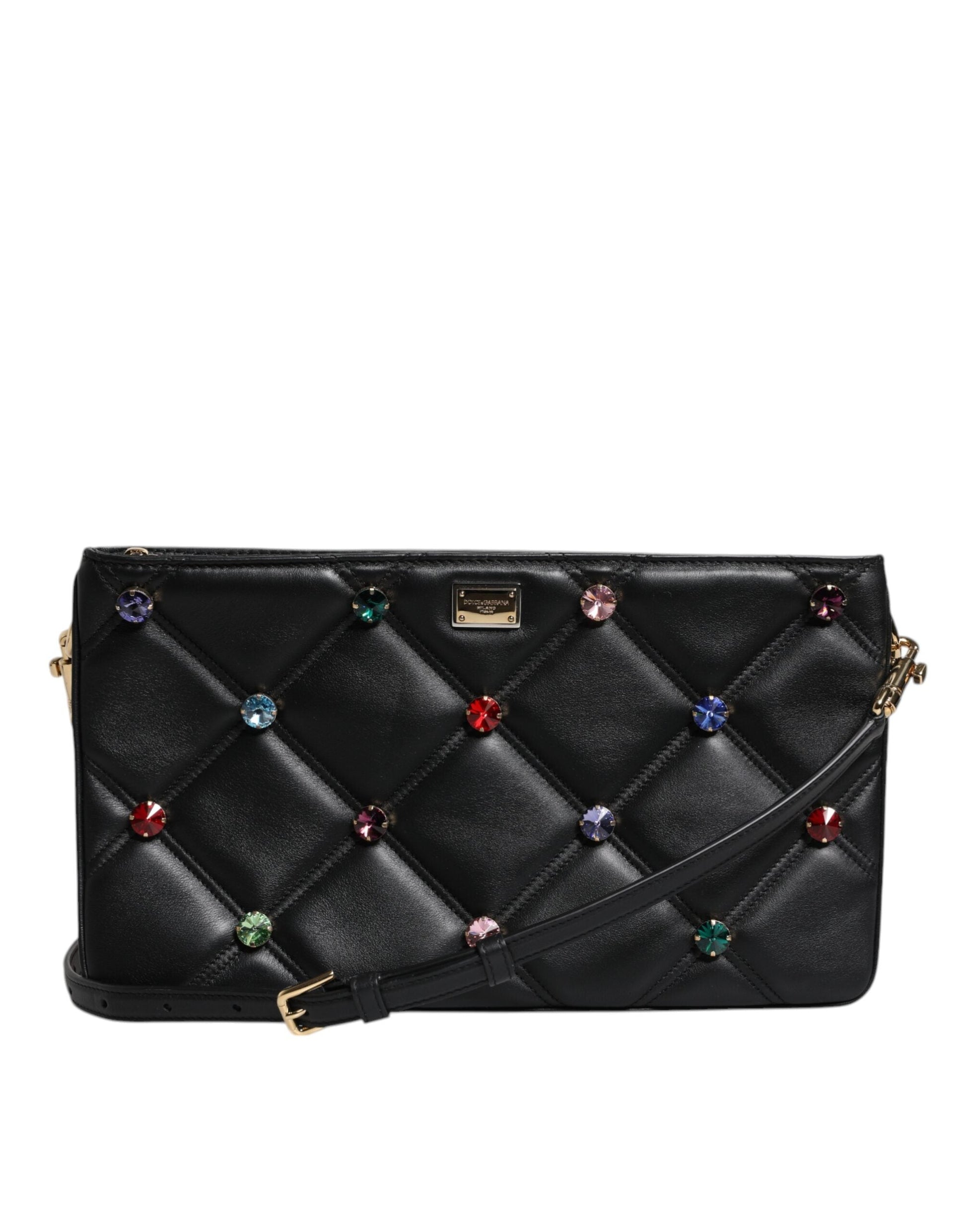 Dolce & Gabbana Black Leather Crystal Embellished Logo Shoulder Bag