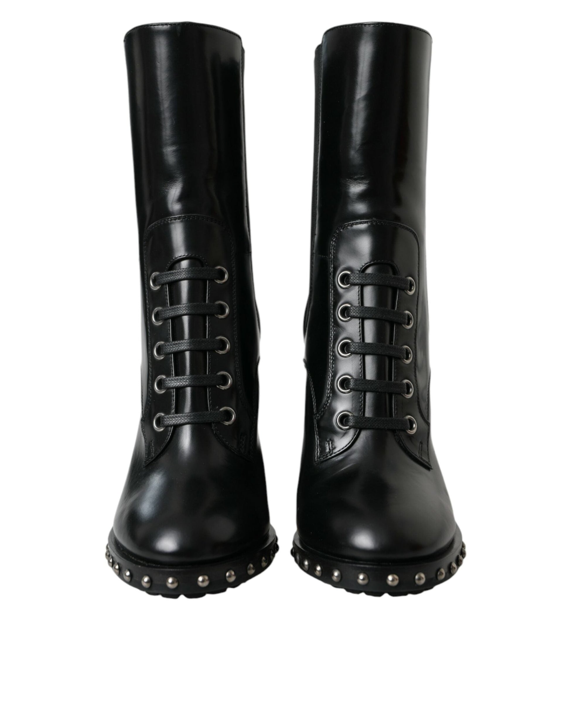 Dolce & Gabbana Black Leather Studded Lace Up Boots Shoes