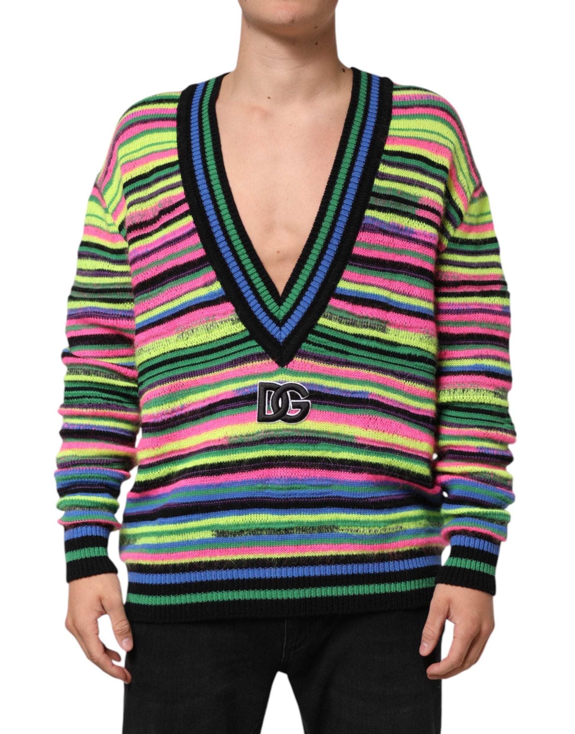 Gorgeous brand new, 100% Authentic Dolce & Gabbana multicolor striped sweater. Featuring a deep V-neckline and prominent DG logo patch at the chest, this eye-catching piece combines vibrant style with premium comfort. Crafted in Italy from high-quality knit fabric, it delivers both flair and softness. Perfect for those who dare to stand out.