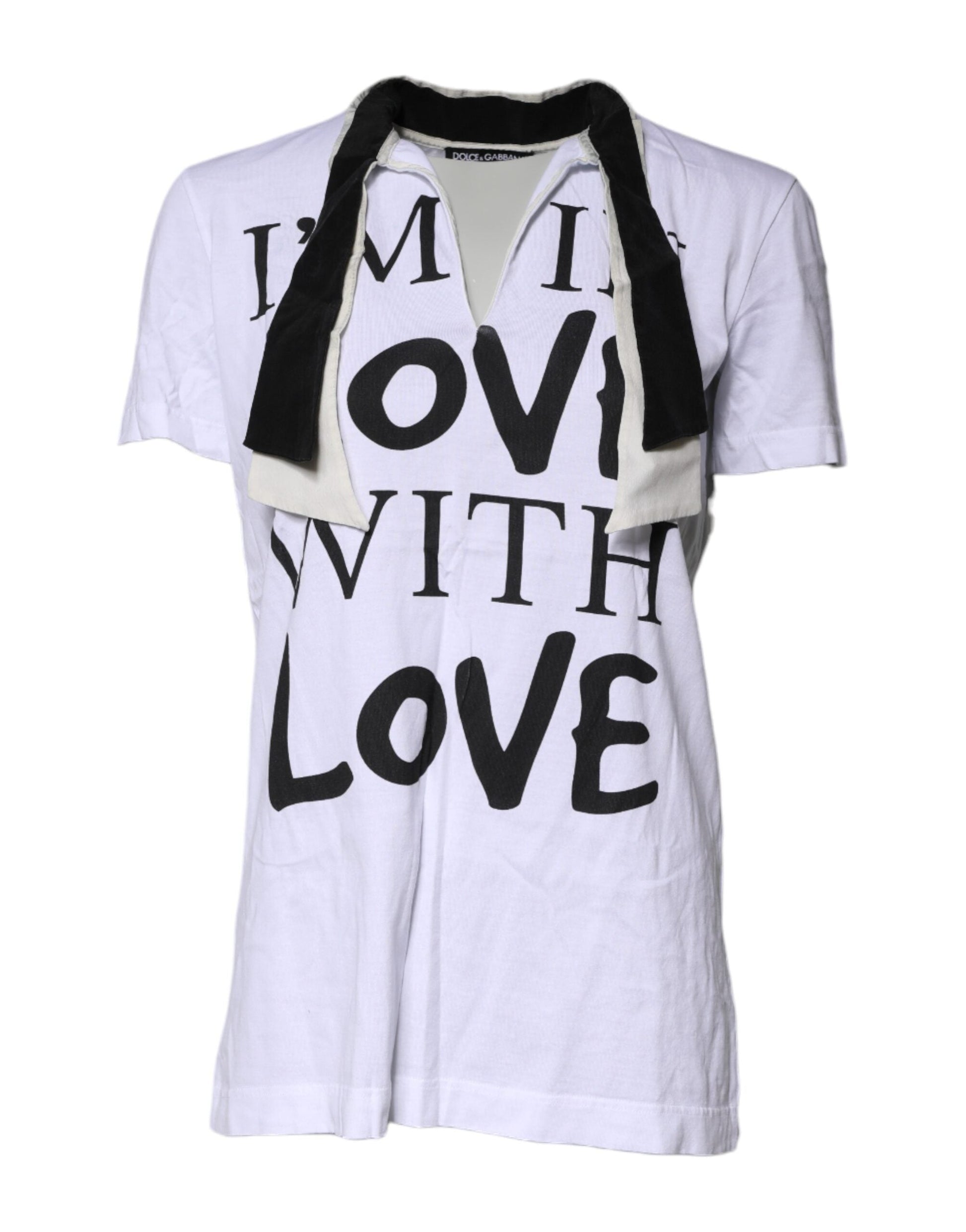 Gorgeous brand new, 100% Authentic Dolce & Gabbana t-shirt with wide ascot collar is made of thin jersey based on soft cotton and durable silk. The “I’m in love with love” print on the front shelf is a ready-made slogan for Instagram.