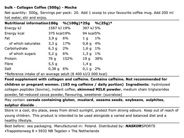 Vous aimez le café. Mais vous surveillez aussi vos apports en protéines. Maintenant, vous pouvez combiner les deux. Découvrez notre café au collagène. Du café Arabica d’origine unique et des peptides de collagène hydrolysé pour simplifier votre quotidien. Vous trouverez 20 g de protéines et 168 mg de caféine dans une seule portion de 25 g. Trop beau pour être vrai ?