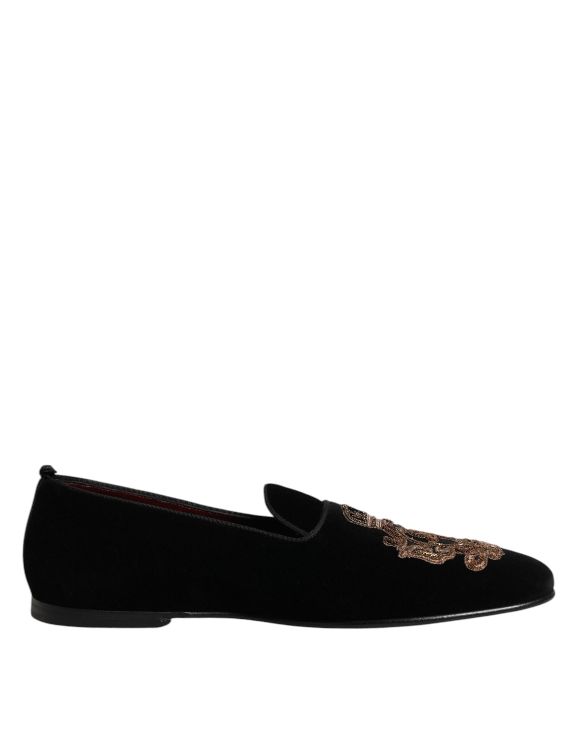 Dolce & Gabbana Black Velvet Gold Crown Mens Loafers Shoes