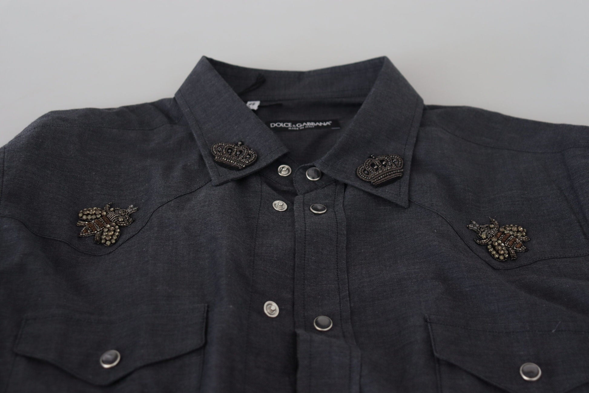Dolce & Gabbana Blue Cotton Denim Crystal Bee Shirt